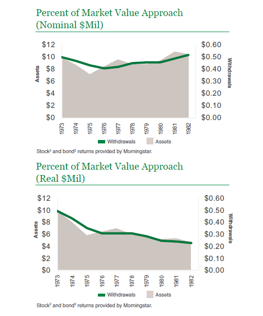 With this spending rule, assets would have fallen by a similar 28% in nominal terms and 41% in real terms from 1973 through 1974. However, because of the higher levels of withdrawals experienced with this approach, nominal and real assets would continue to decline even as the stock market recovered after the bear market, falling by 34% in nominal terms and 70% in real terms by the beginning of 1982. This would leave the portfolio with only $6.6 million in nominal assets by the beginning of 1982.